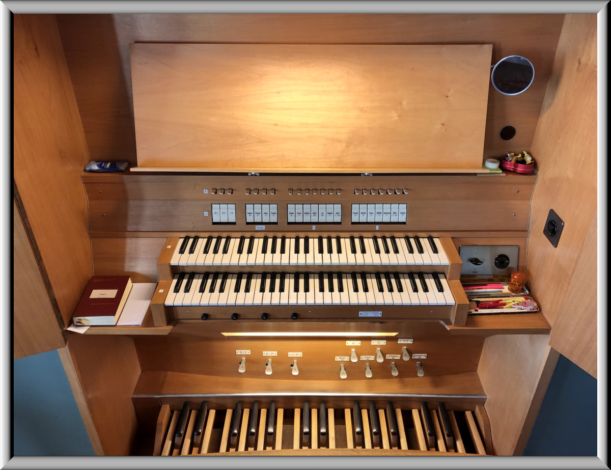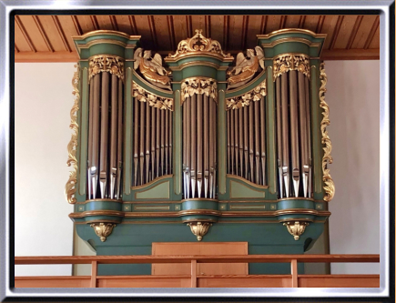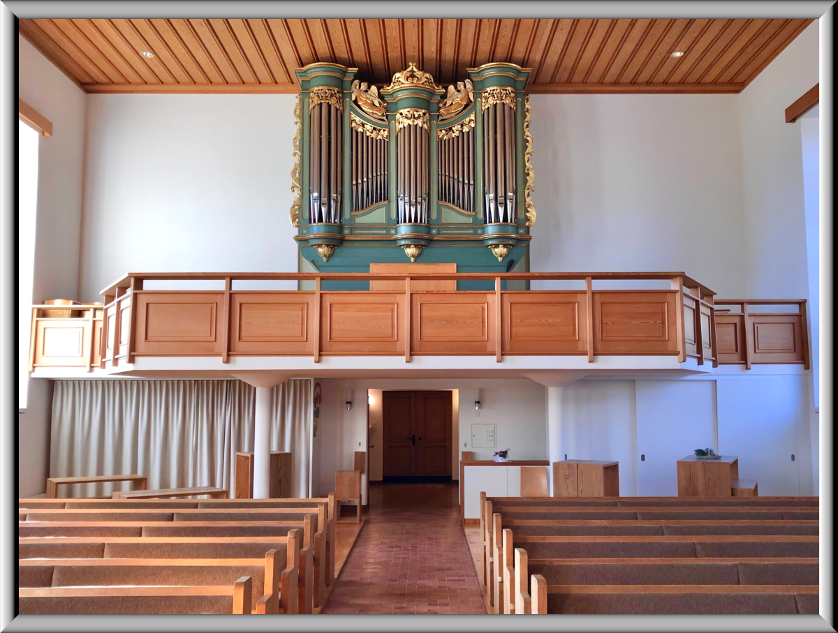 Orgel mit 16 Registern auf 2 Manualen und Pedal ins alte Gehäuse.