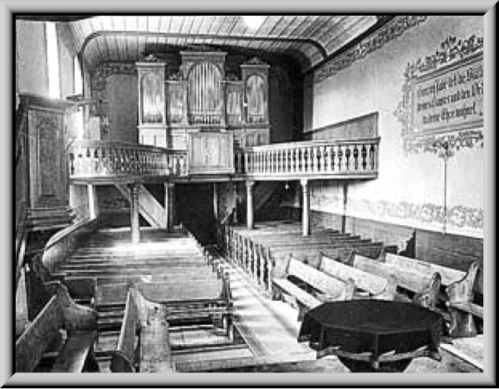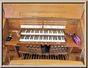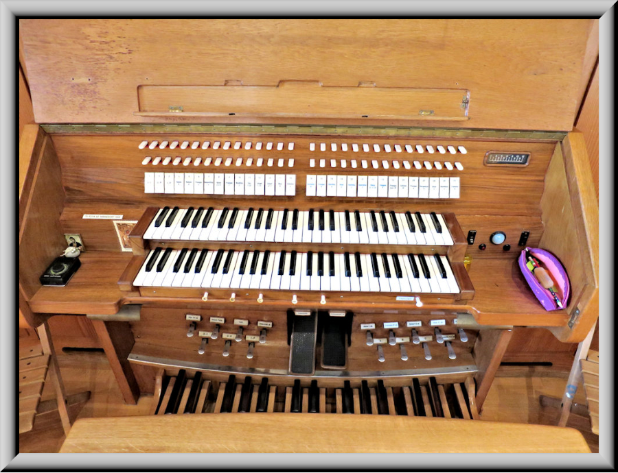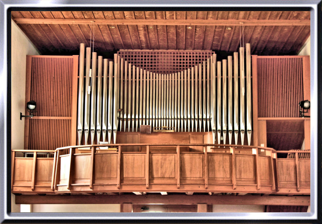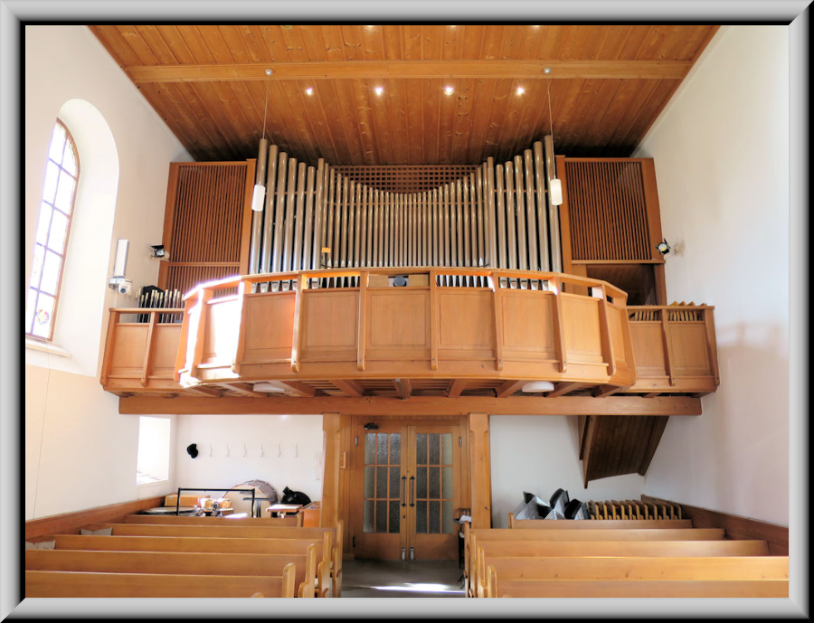 Membranladenorgel mit 18 Registern auf 2 Manualen und Pedal. Die alte