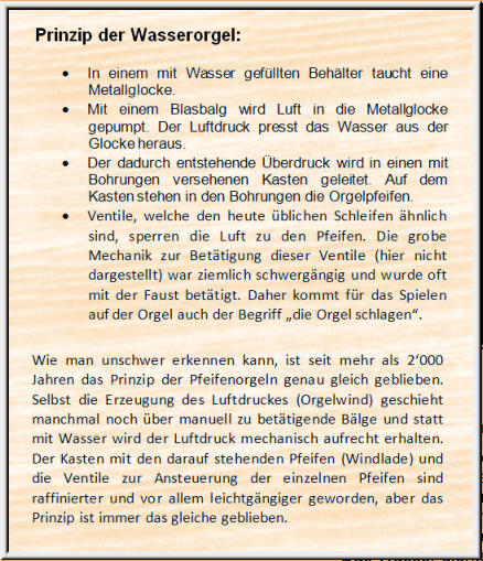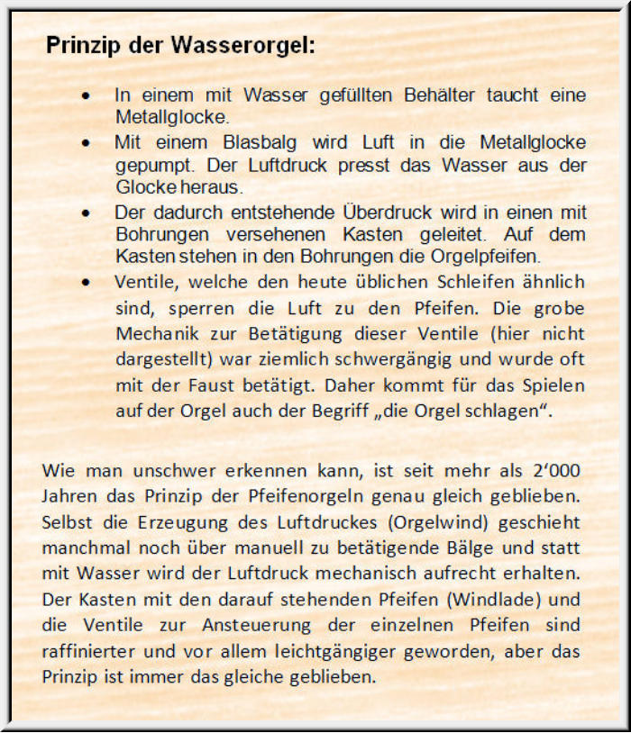 228Im Museum der Römersiedlung Augusta Raurica in Augst BL steht diese spielbare Nachbildung der in Aquincum (Budapest) gefundenen Orgel aus der Römerzeit. Das Original wurde im Jahr 228 n. Chr. dem dortigen Feuerwehrkollegium gestiftet, und 298 (unspielbare) Teile sind im Aquincum Museum in Budapest erhalten. Das Wasser diente ausschliesslich zur Erzeugung des nötigen Winddrucks.(Siehe auch die spielbare Nachbildung einer Wasserorgel im Orgelmuseum Roche VD.)