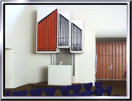 Die Orgelwerke sind auf einer Konsole an der Wand montiert. Der