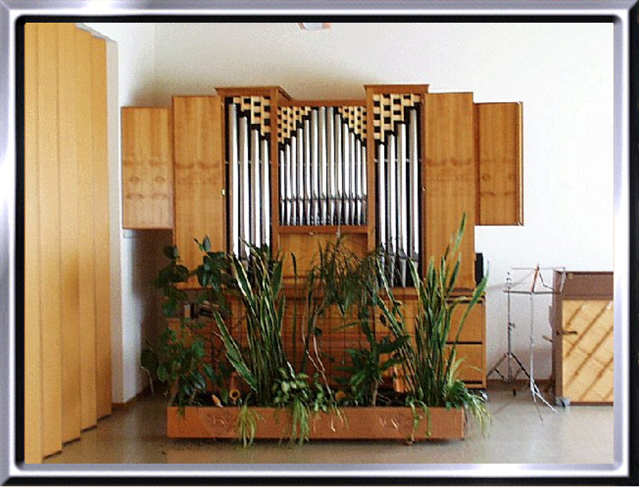 angebaut, und zwei Flügeltüren schützen die Orgel, wenn der Saal für