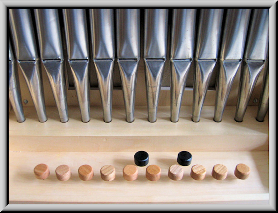 Offene Metallpfeifen auf 4'-Basis mit der sog. Taubenei-Mensur, d.h.,