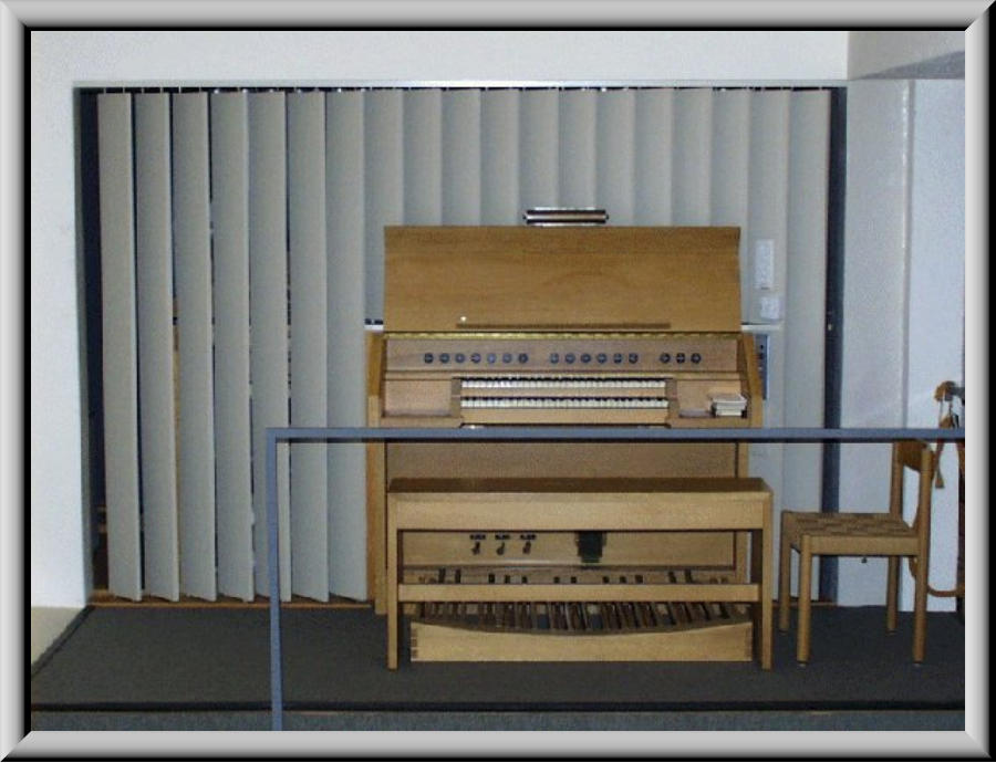 Spieltisch steht vor einer Jalousie, hinter welcher die Orgel aufgebaut