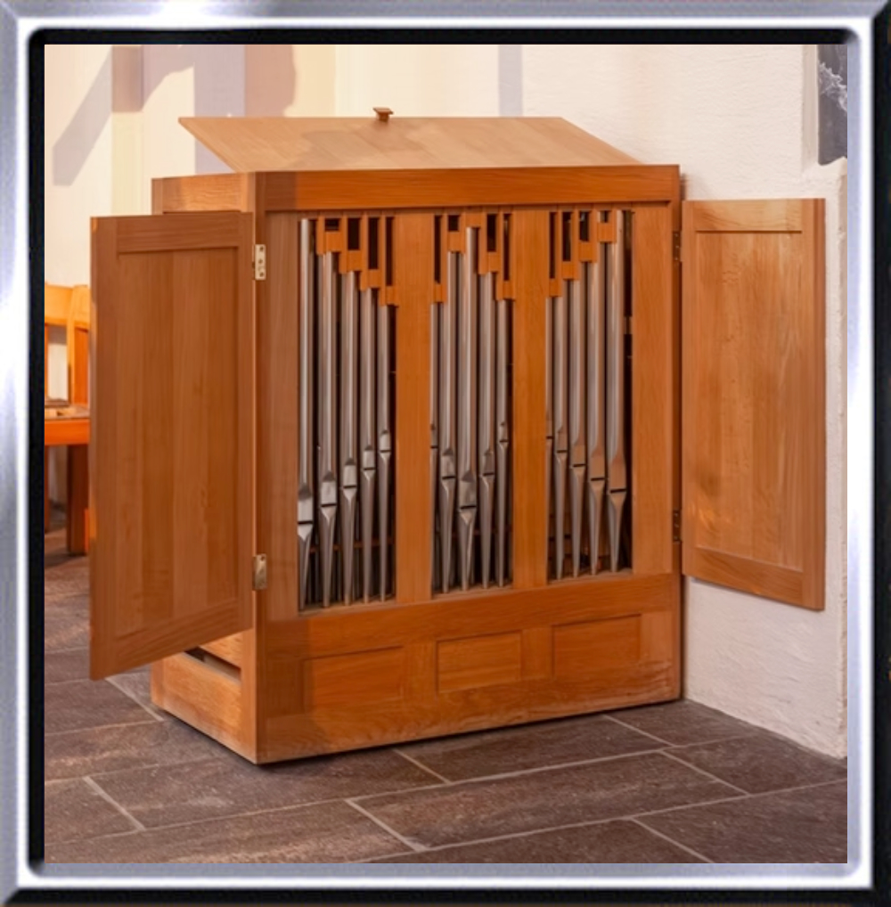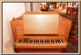 Truhenorgel mit 4 Registern auf einem Manual ohne Pedal aufgestellt.