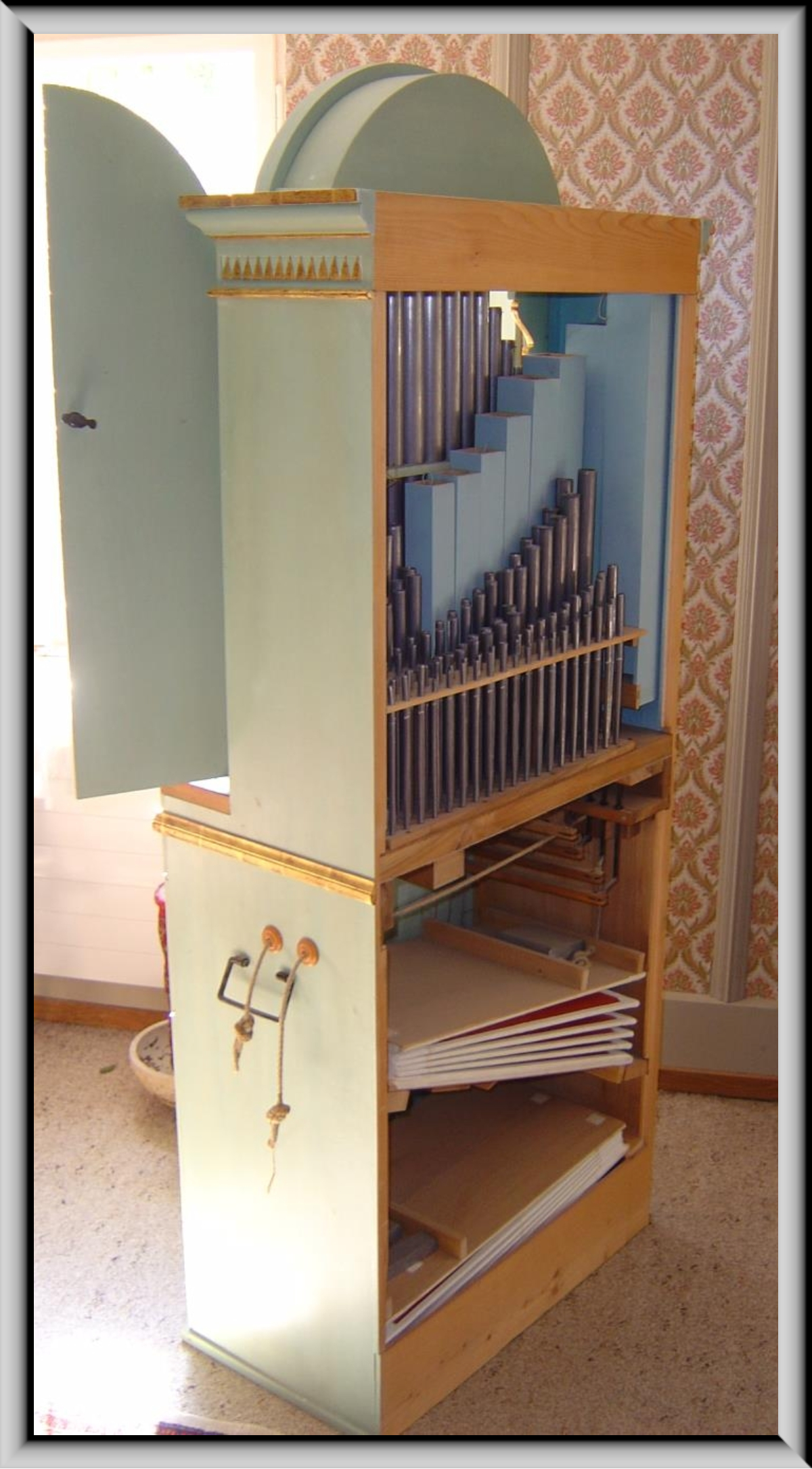 Gehäuse ist aus dünnem Lindenholz gefertigt. Die Metallpfeifen be-