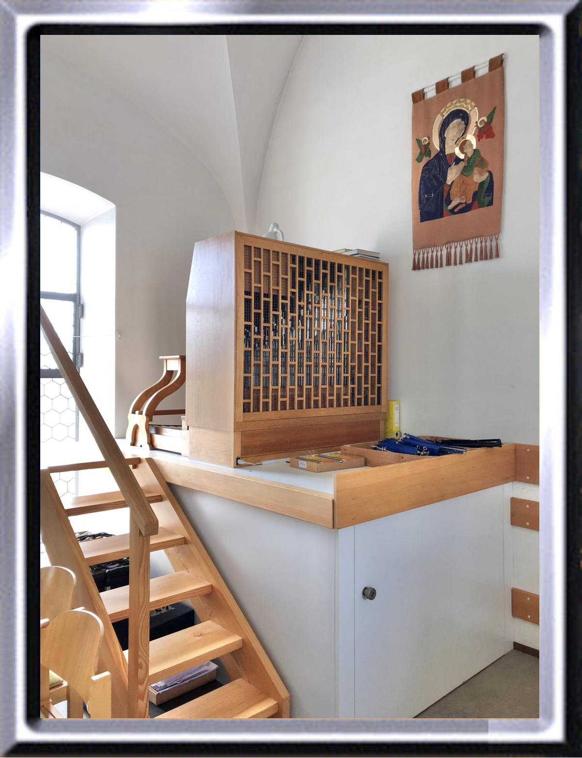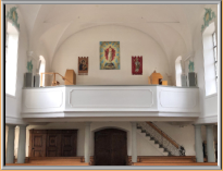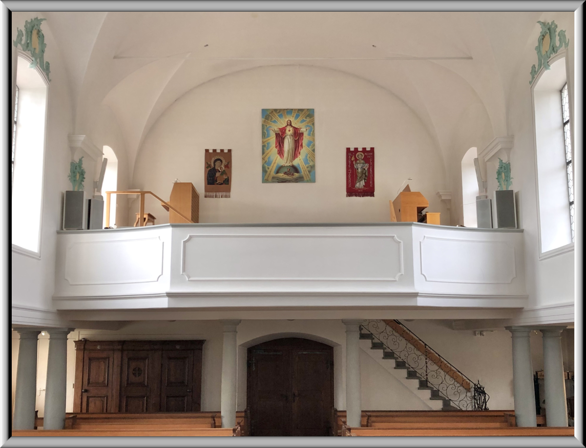 Die Truhenorgel befindet sich links oben auf der Empore auf einem