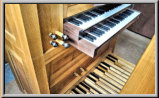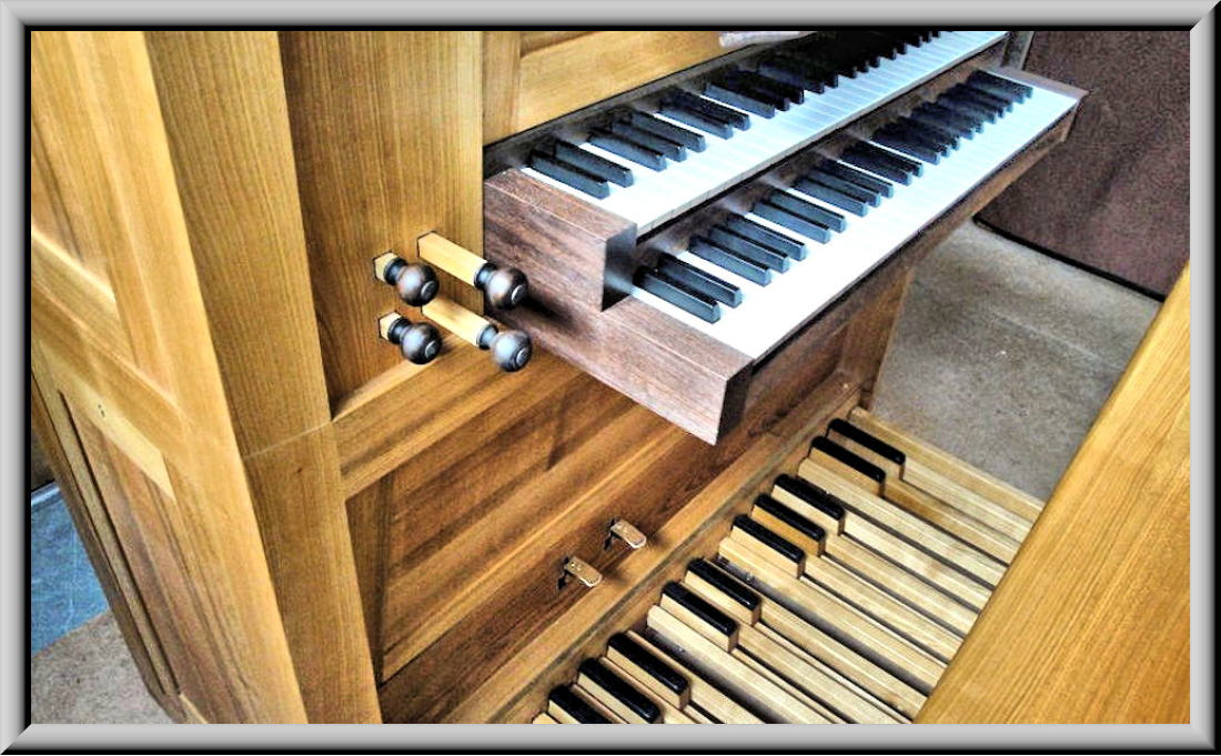 mit 3 Registern auf 2 Manualen und angehängtem Pedal. Alle Pfeifen