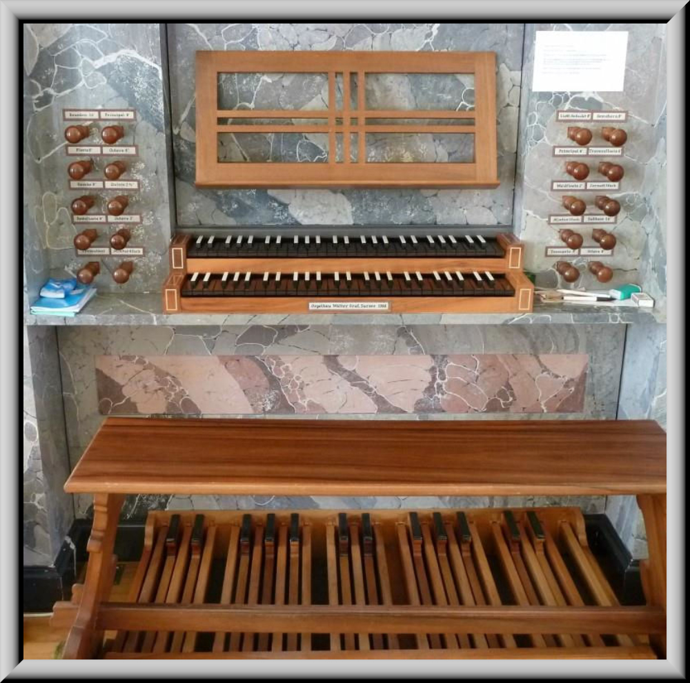 Registern auf 2 Manualen und Pedal (>Disposition). Aus der