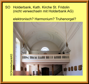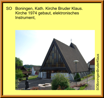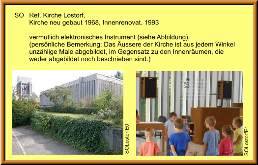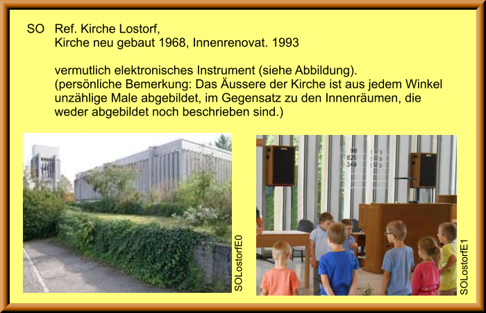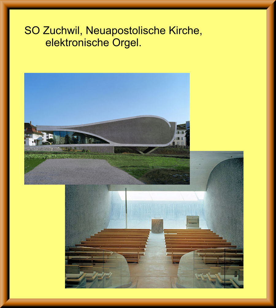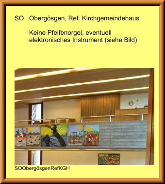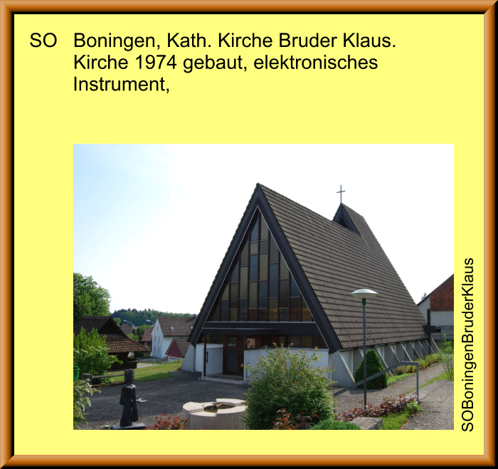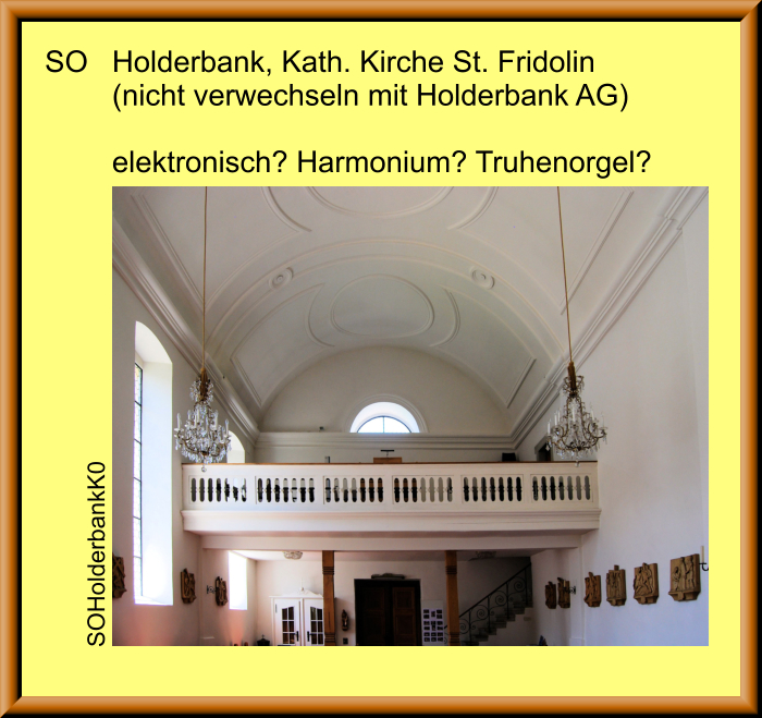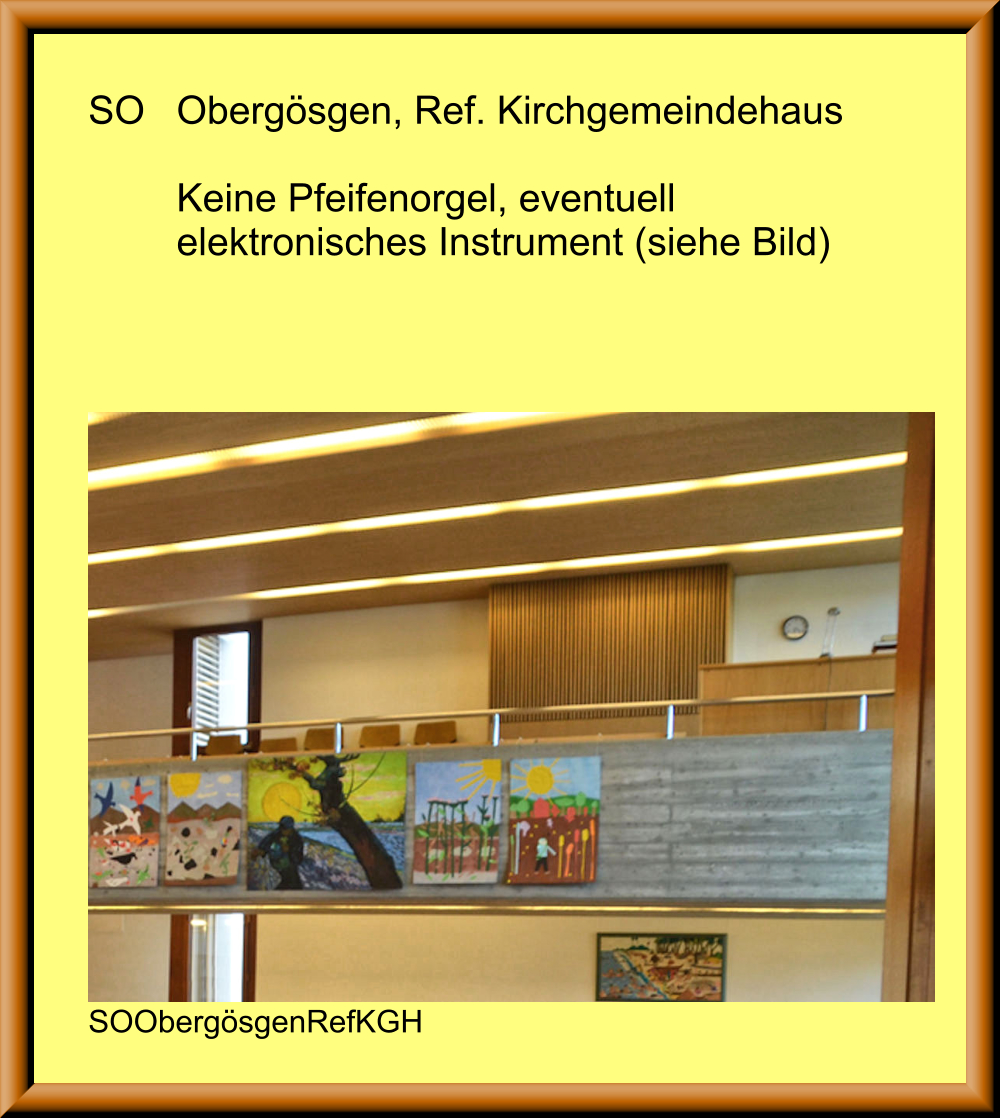 SOBoningenKath. Kirche Bruder Klaus-> elektronisches InstrumentSOFlumenthalKath. Kirche, -> elektronisches InstrumentSOGerlafingenEv.-Method. Kirche (siehe Lohn-Ammansegg kath.)keine OrgelSOGrenchenHausorgel Knechtle, (Organist Eusebiuskirche)SOGünsbergRef. Kirchgemeindehaus keine OrgelSOHärkingenalte Kirchekeine OrgelSOHolderbankKath. Kirche -> was wir wissenSOHubersdorfKapelle keine OrgelSOHuggerwaldKapelle Ober-Huggerwald (bei Kleinlützel) HarmoniumSOLostorfRef. Kirche von 1968 -> elektronisches InstrumentSONuglarKapelle St. Wendelin (Ref, Gottesdienste, Orgel?)SOObergösgenRef. Kirchgemeindehaus-> elektronisches InstrumentSOWisenKath. KircheSOWolfwilRef. KirchenzentrumSOZuchwilNeuapostolische Kirche -> elektronisches Instrumentweitere mögliche Standorte von Pfeifenorgeln:+ Konzertsäle+ Alters- und Pflegeheime+ Spitäler+ Musikschulen, Konservatorien+ Friedhöfe, Abdankungshallen+ private Instrumente+ Feldkapellen, Ortskapellen.