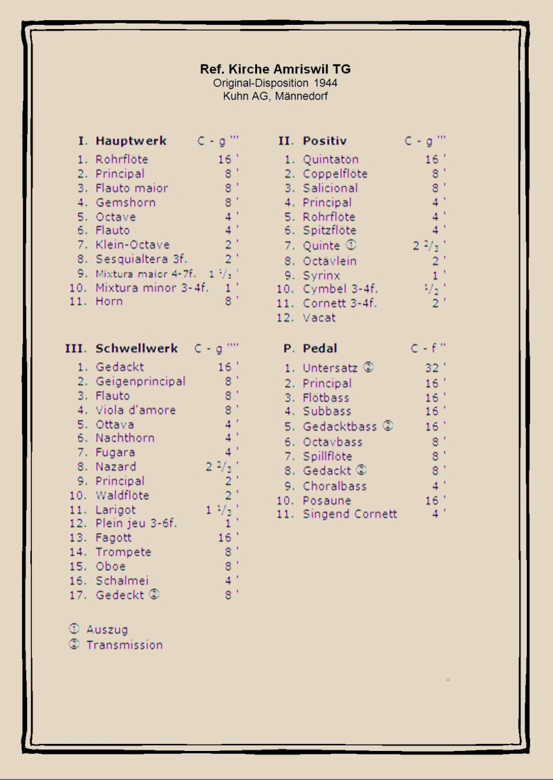 - Franz Lüthi, „Die Kuhn-Orgel in der evangelischen Kirche Amriswil“, in: Bulletin der St. Galler Orgelfreunde