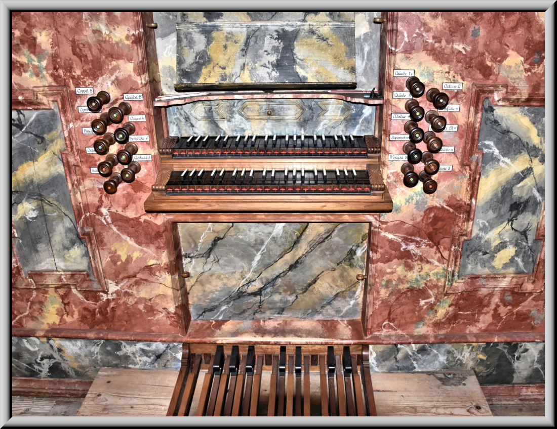 eine grosse Orgel mit 18 Registern auf Hauptwerk, Rückpositiv und