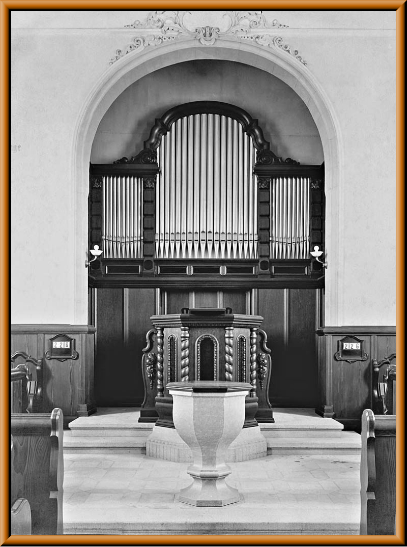 aufgestellt, mit Blick des Organisten gegen die Kanzel.