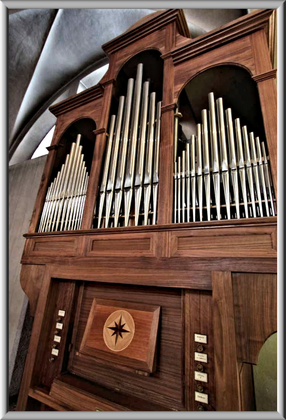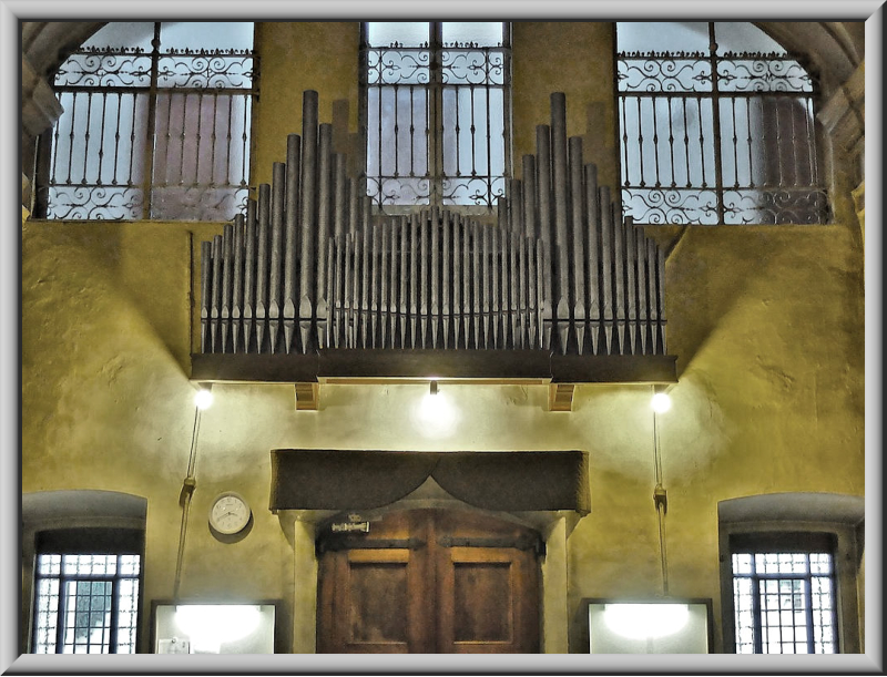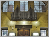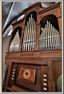 Über dem Eingangsportal der Kirche ist eine Pfeifenfront montiert, zu der