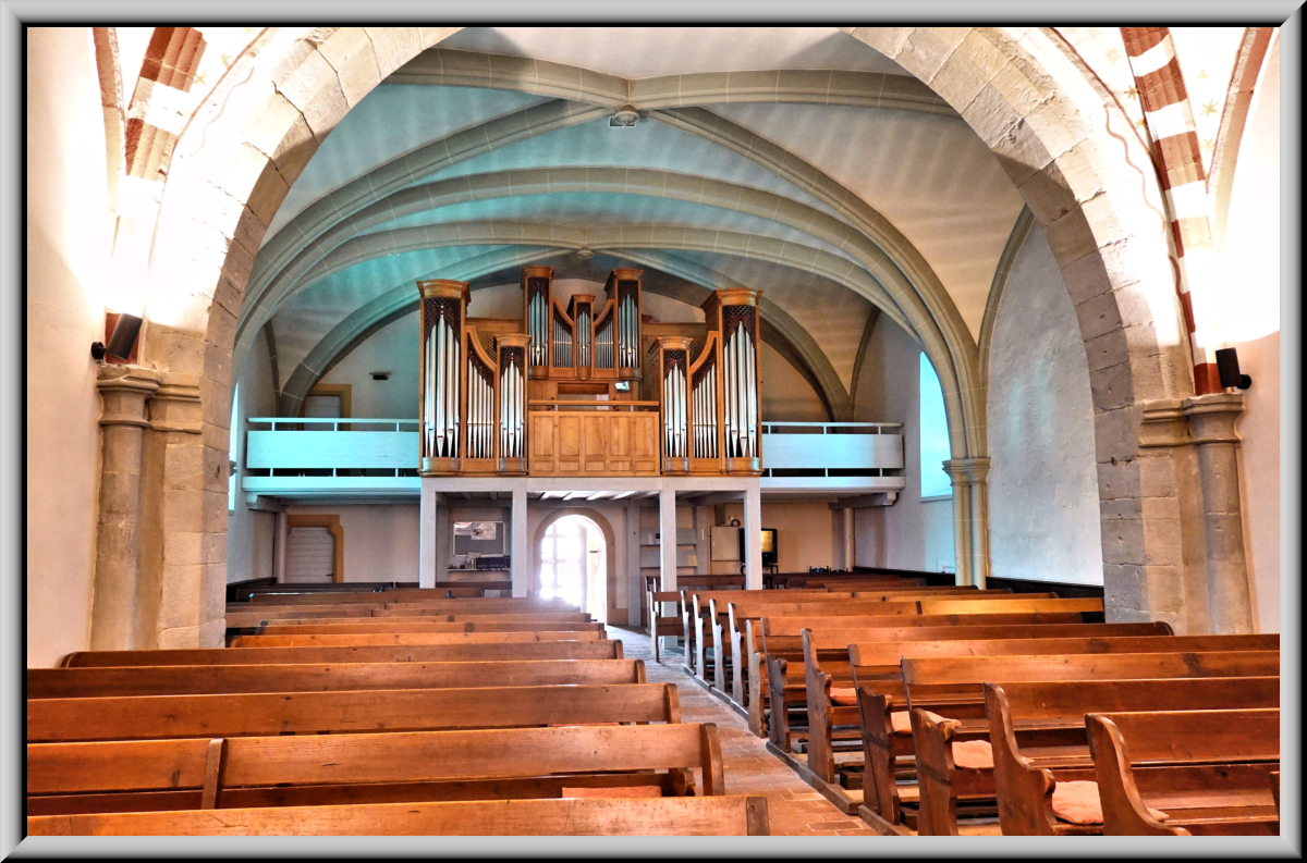 compte 16 jeux sur deux claviers et pédale. Le Grand-Orgue est placé en