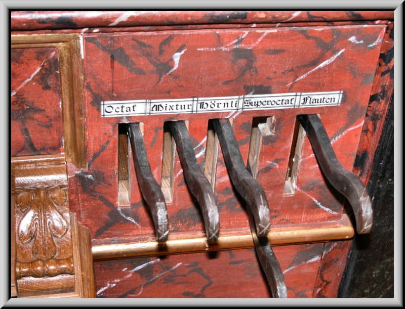 Bild Spieltisch: Orgelmusik Pfäffikon, Organistenteam; Bild Registerhebel: Orgelbau Füglister, Grimisuat
