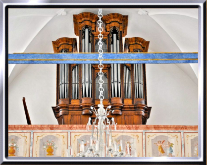 Orgel sind zwei dreifaltige Bälge aufgestellt. Der Wind kann über einen