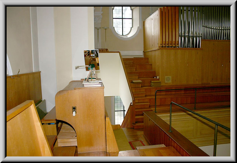 Freipfeifenprospekt. Der elektrische Spieltisch befindet sich auf der
