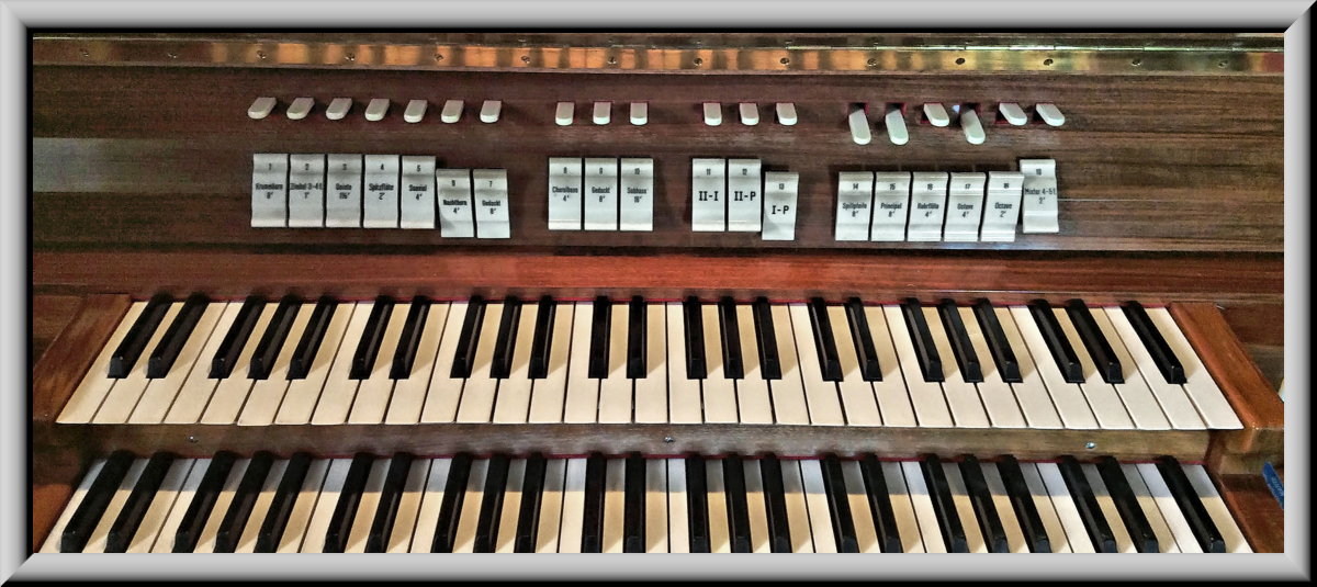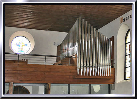 Manualen und Pedal. Das Instrument steht im Chor der Kirche und füllt