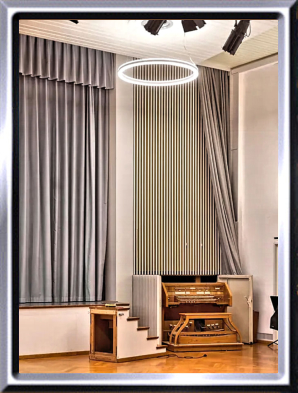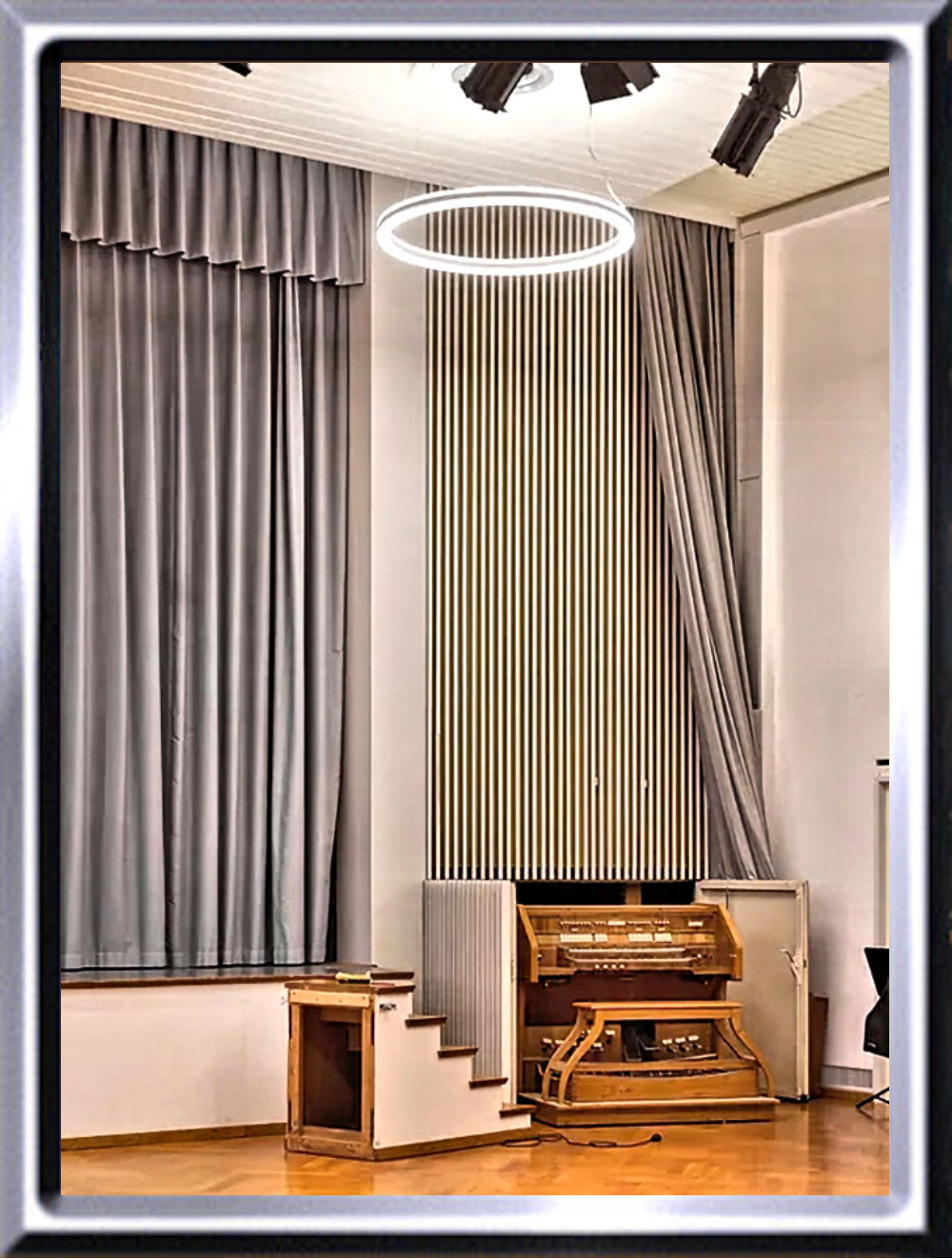 rechts neben der Bühne hinter Holzlamellen versteckt, der fahrbare